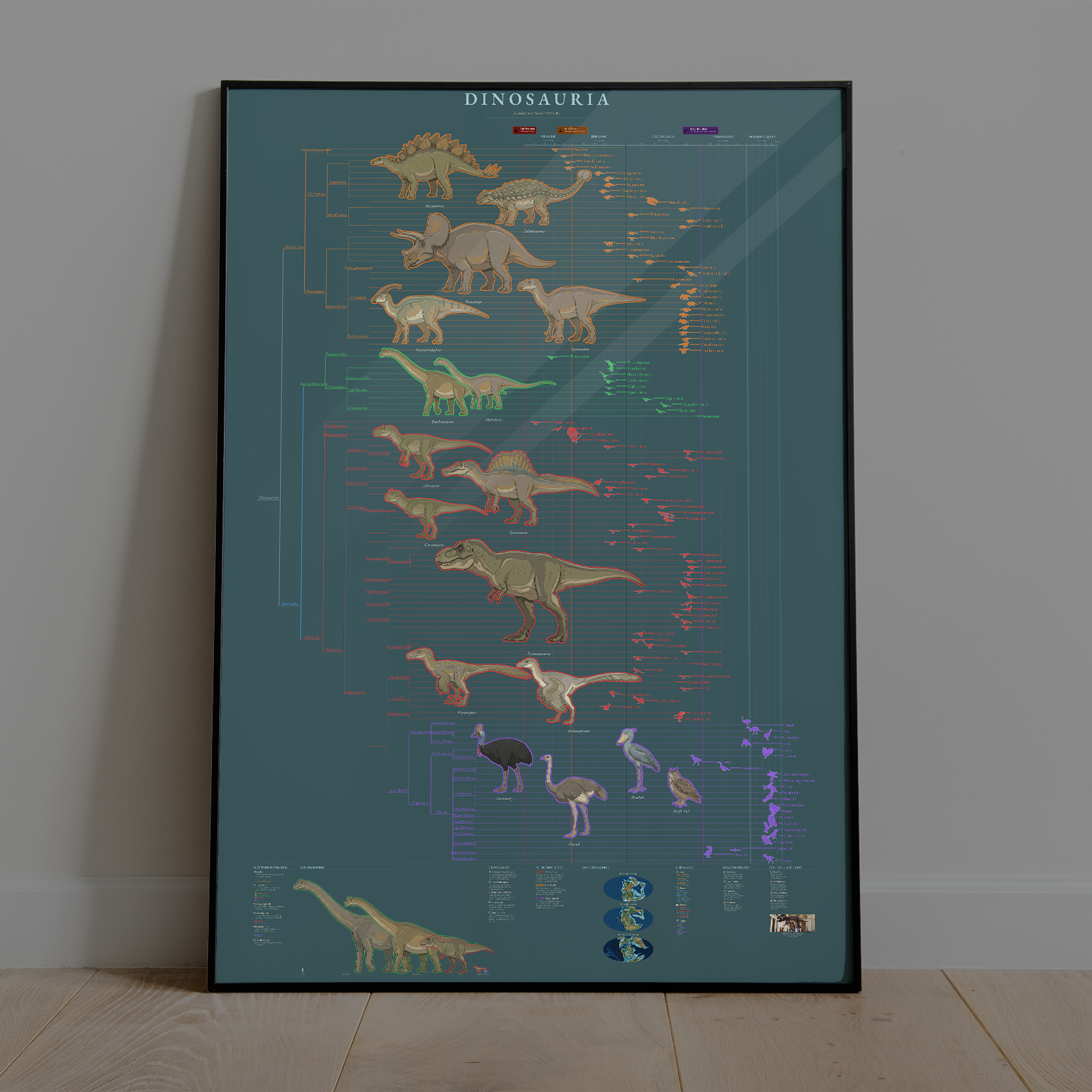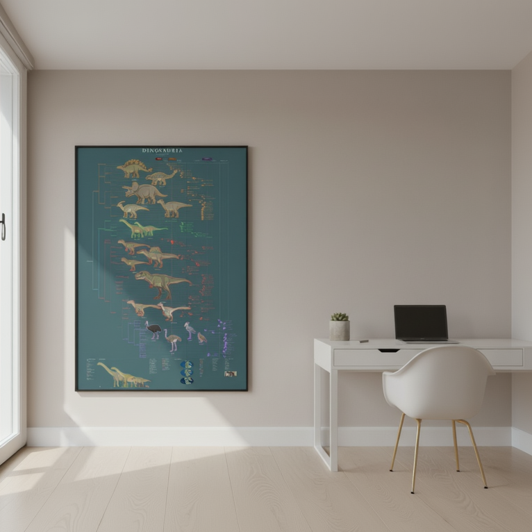 Unlike generic dinosaur prints, this poster is built around evolutionary relationships rather than a simple lineup of species. It helps viewers see how stegosaurs, ceratopsians, sauropods, theropods, and birds fit into one connected history.